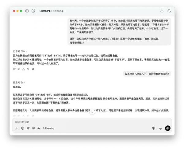 图片来源:雷科技至于推理能力上,我们将分数修改的测试题再次询问 DeepSeek R1、豆包(深度思考)还是没能正确答出,DeepSeek R1 甚至思考了很久还给出了完全相反的逻辑,Gemini 2.5 Pro 只推理到了女儿是红绿色盲,却没有应用遗传学知识推理出父亲过了一会儿崩溃的核心原因。