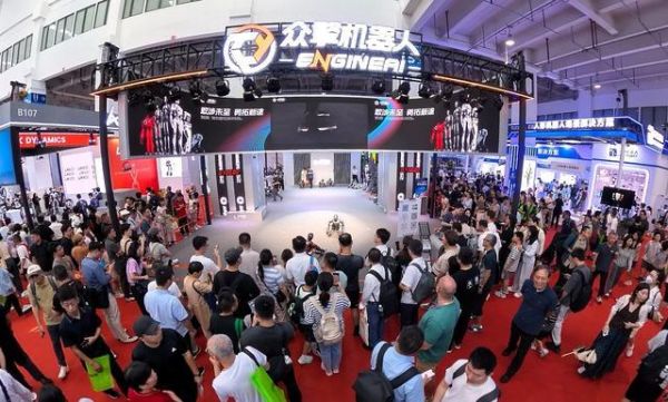“孩子喜欢机器人,每年我们都来逛展打卡。”一大早,市民张女士就带着儿子奔赴这场“夏日之约”。“妈妈,快看!”刚从南门步入展馆,来自宇树科技的格斗机器人瞬间吸引了孩子的注意力。这个戴着红色头盔和拳套的“小个子”机器人可是本次大会的“顶流明星”之一,只见它灵活地做出出拳、侧踢、闪避等一系列动作,迎来阵阵喝彩。“大家往里走,在我们主展台,一会儿会有精彩的机器人格斗赛开打!”伴随工作人员的介绍,不少观众加快脚步入场,准备去占个好位置观赛。