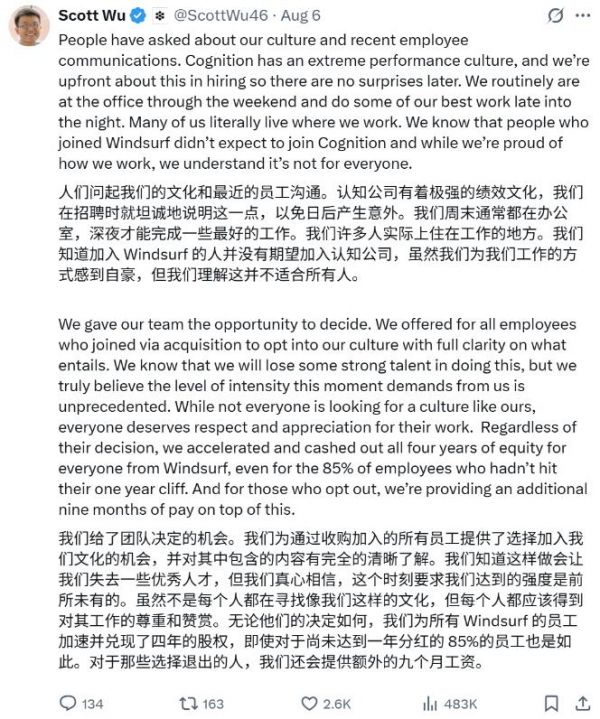 在相关争议发酵之后,8 月 6 日Scott Wu在 X 上发文回应此事:“无论他们选择离开还是留下,我们都已经加速兑现了所有 Windsurf 员工的 4 年股权价值——即使是那些分红尚未满一年的 85% 员工,也都拿到了这笔钱。对于选择离职的人,我们还额外补偿了 9 个月工资。”