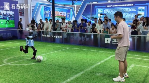 在机器人AI自主决策踢球展位,看看新闻Knews记者带您一起体验与机器人踢足球的乐趣。
