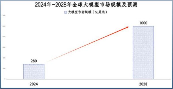 2024年,全球大模型市场规模280亿美元左右,而到2028年全球大模型市场规模将超过1000亿美元,期间年复合增速接近37.5%。