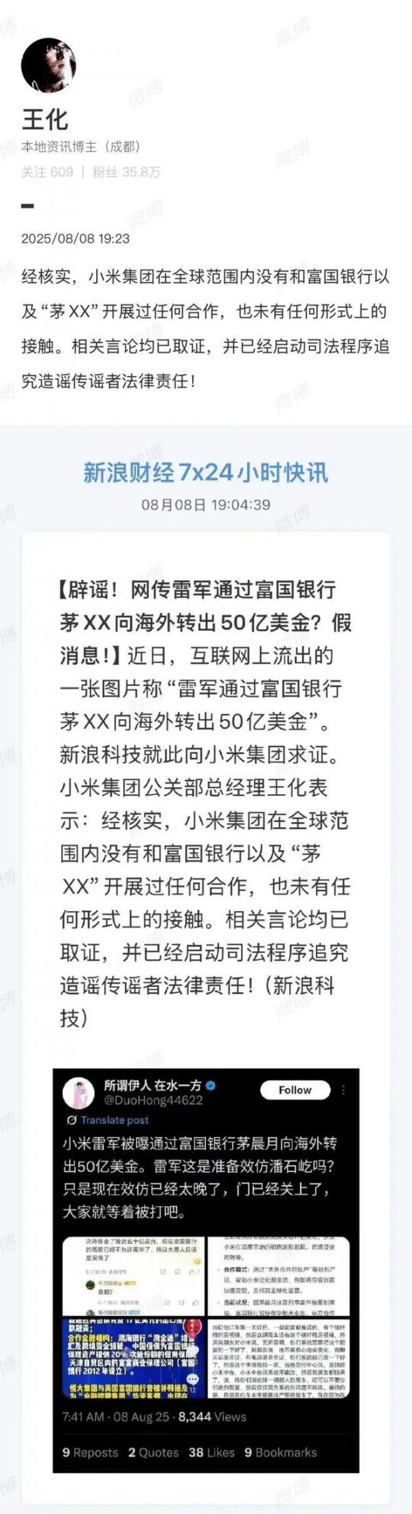 8月8日,小米集团公关部总经理王化辟谣网传“雷军通过富国银行茅XX向海外转出50亿美金”: