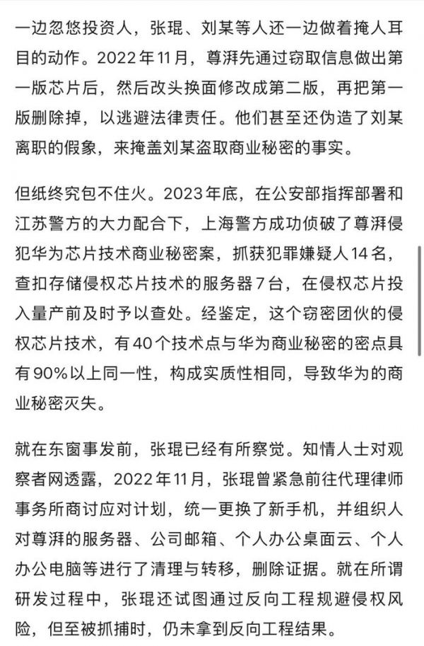 知情人士对观察者网透露,这些离职员工为了规避华为的竞业限制协议和其他风险,甚至改了名字,比如高管周某化名胡某,高管顾某某化名杜某某,王某某化名王某扬。他们更严重的犯罪行为,在于窃取了保密信息。有20多位原华为员工离职前大量访问非本职工作文档,通过抄写、拍照、截图等方式窃取芯片电路图、版图、规格参数,以“投名状”入职尊湃。