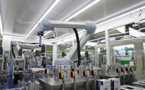 以口服制剂液体柔性化生产线为例,后端采用8套视觉系统整线在线检测、15台机械手协同作业、32米磁悬浮输送带高速运转。15台工业机器人组成精密矩阵,与磁悬浮输送系统配合默契,400瓶产品1分钟就能完成包装,全流程升级将每班22人优化至7人,大幅提升了生产效率。