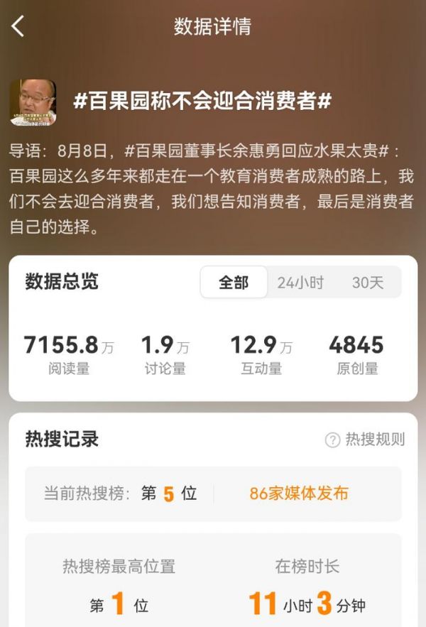 创始人余惠勇的一番言论,让百果园连续几天挂在微博热搜上。