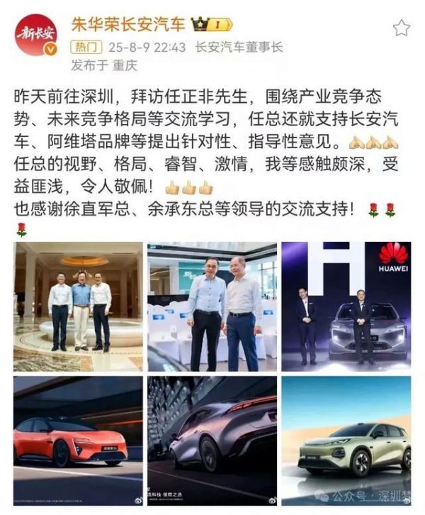 8月9日晚,中国长安汽车集团董事长朱华荣微博发文,称周五前往深圳拜访华为公司创始人、CEO任正非,围绕产业竞争态势、未来竞争格局等交流学习。