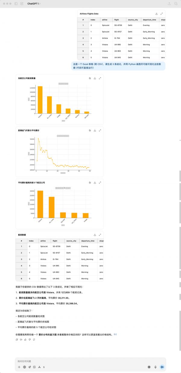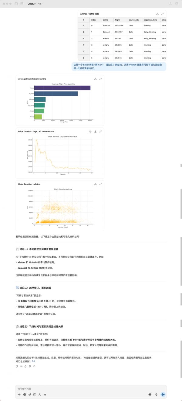 这是我随便从Kaggle(数据分析竞赛平台)上下载的一个航班数据集,大小有24 MB,4o根据我说的三个结论,然后就是给我生成了三张图,同时,它还是一样喜欢使用emoji来「美化」自己的回答。