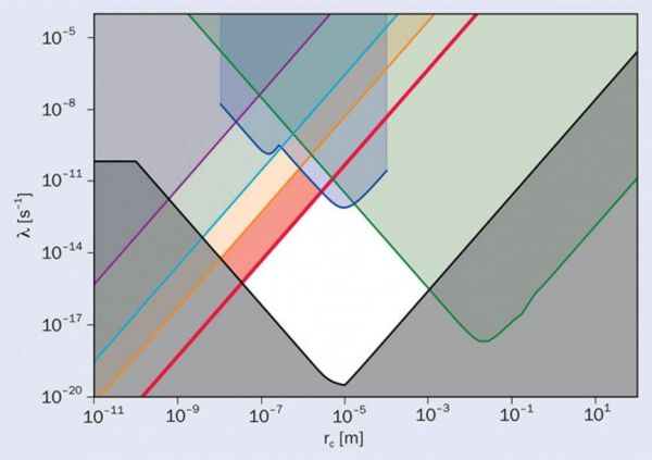 探测物理坍缩“质量正比”(mass proportional)物理塌缩模型的上限,其中波函数以塌缩率λ被局域在(关联)长度rc的范围。图中阴影区域为各类实验所排除的参数区间:冷原子干涉仪(cold-atom interferometry)(品红)、引力波探测器(绿色)、悬臂实验(蓝色)、整体(bulk)加热限制(青色),以及由桑福德地下研究设施(Sanford Underground Research Facility)马约拉纳验证装置(Majorana Demonstrator)合作组[注2]开展的自发X射线辐射搜寻(红色)。先前由自发X射线辐射得到的限制以橙色表示。理论下限用黑色实线标出。图片来源:Adapted from Majorana Collab.2022 Phys.Rev.Lett.129 080401