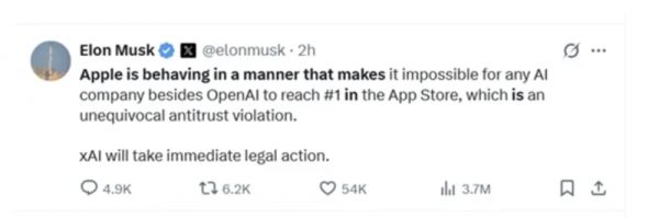 “苹果的行为使得除OpenAI之外的任何一家人工智能公司都无法登上App Store榜单第一名,这显然违反了反垄断法。xAI将立即采取法律行动,”马斯克在社交媒体平台X上写道。