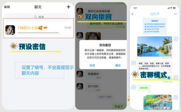 双向撤回功能让聊天记录可随时彻底删除,避免身边人窥探;并且还隐藏了一个密聊模式,进去之后所有信息被打码,消息也可以设置阅读时长,自动销毁。