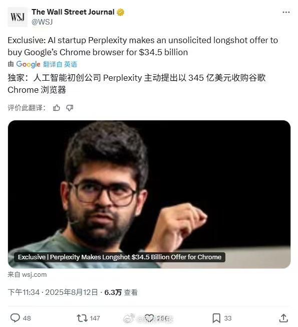 AI初创公司Perplexity拟345亿美元收购谷歌Chrome