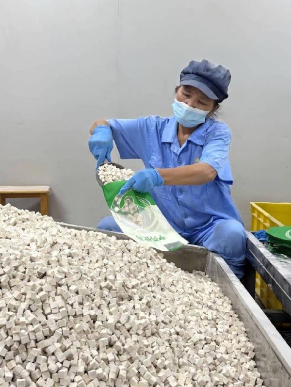 工人将筛选好的茯苓丁入袋