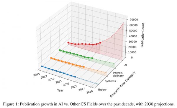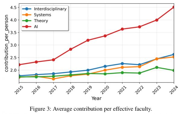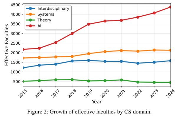 AI领域的投稿量激增,导致人均产出变得难以维系。数据显示,AI的快速增长可能对其他计算机科学领域产生了「虹吸效应」,导致理论和系统等领域的教职员工数量出现下降。
