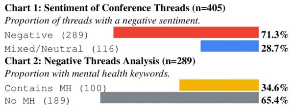 对Reddit论坛的系统性分析显示,社区对顶级会议普遍存在负面情绪。在超过400个相关讨论串中,71%表达了不满,其中超过三分之一(34.6%)提及了「焦虑」、「倦怠」等心理健康问题。