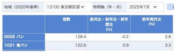为了应对成本变化,面包店也不得不调整售价。根据日本消费者物价指数(CPI),以2020年面包、吐司均价为基准线(100%),2025年面包、吐司价已上涨至128.4%和122.6%。