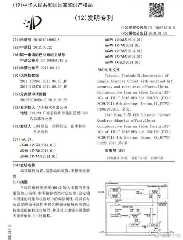 本次诉讼的核心,是华为持有的欧洲专利EP2725797B1。这个专利于2011年首次申请,技术核心是一种应用于视频编解码领域的图像滤波技术,更具体地说,是样本自适应偏移(Sample Adaptive Offset, SAO)技术的一部分。