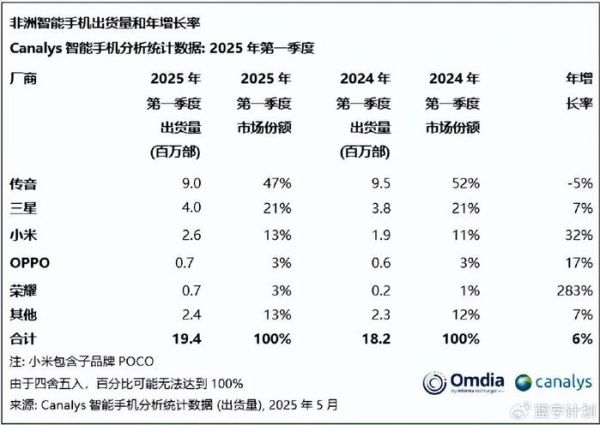 5 月 27 日,Canalys发布了2025年第一季度非洲地区智能手机市场报告,数据显示尽管传音在2025年第一季度的非洲智能手机市场依然占据主导地位,以900万部的出货量和47%的市场份额稳居第一,但其同比下滑5%的业绩,与小米的迅猛增长形成了鲜明对比。