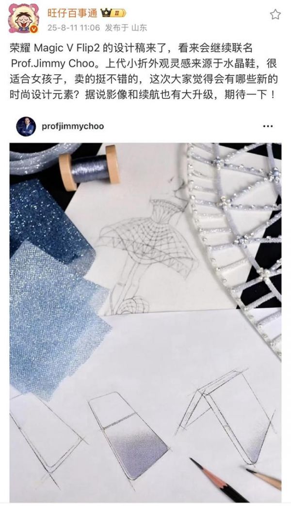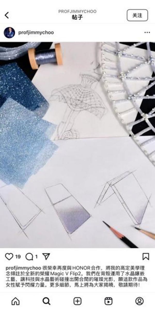 这是荣耀第二次与Prof.Jimmy Choo携手打造高定款设计,就在前一天,周仰杰还在ins平台上发布了他的设计手稿,并表示此次在背壳运用了水晶镶嵌工艺,让荣耀Magic V Flip2的高定款设计带来更具视觉张力的美感,让人期待亲手拿到实物的那一刻。