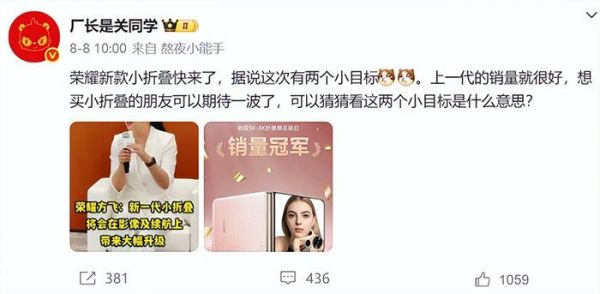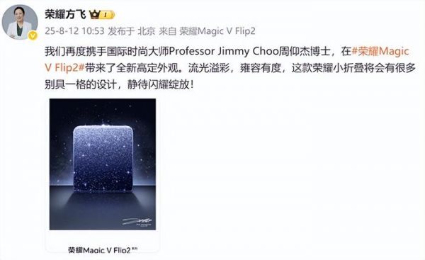 荣耀产品线总裁方飞转发了这张海报,并表示,“这款荣耀小折叠将会有很多别具一格的设计,静待闪耀绽放!”