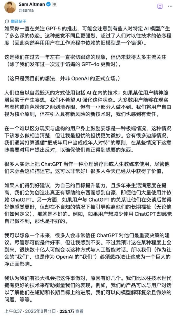 说到底,OpenAI 这次的摇摆其实揭示了一个无解的困境:我们既想要 AI 的温暖,又害怕这种温暖;既嫌弃它的谄媚,又怀念它的体贴。