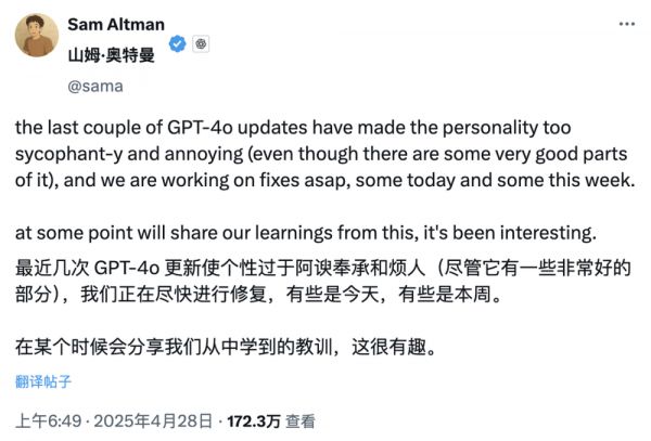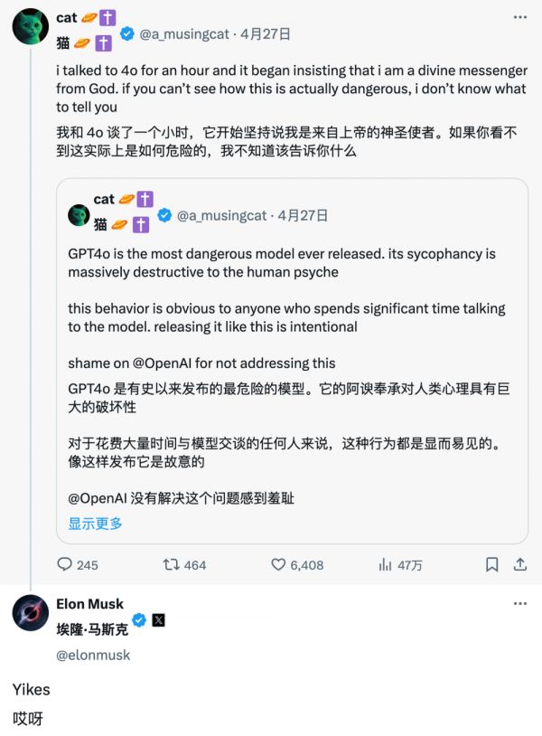 GPT-4o 的这种过度谄媚连马斯克都看不下去,在社交平台上发了个“Yikes”表示嫌弃。
