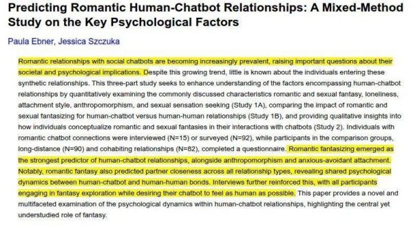 来自德国杜伊斯堡-埃森大学团队的研究还发现,浪漫幻想比孤独感、性幻想、依恋类型等变量更能解释人机浪漫关系的形成。用户越倾向于将机器人视作“有感情、有道德判断力”的人类,越容易发展深层次关系。