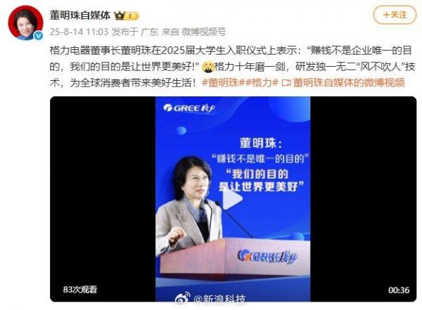 【#董明珠称赚钱不是企业唯一目的##董明珠寄语新员工#】@董明珠自媒体 发文称:格力电器董事长董明珠在2025届大学生入职仪式上表示:“赚钱不是企业唯一的目的,我们的目的是让世界更美好!”