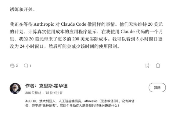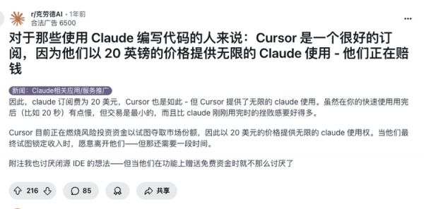 有分析师(Ed Zitron)指出,包括Cursor在内的几乎所有生成式AI软件公司,都面临深度亏损的现实。它们的产品只能以极低的或亏损的价格提供服务,无法覆盖模型调用支出和运营成本。Reddit社区也有人直言:Cursor的营收虽高,但扣除硬件、电力、算力、研发和客户支持等成本后,利润微乎其微。