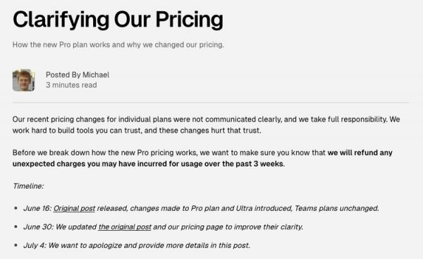 同样在上个月,Cursor曾因其“I’ll keep it unlimited”的Pro收费模式悄然变更为计算tokens限制,导致大量用户抱怨“实际上并非无限”,纷纷在社群中吐槽,迫使公司CEO出面道歉、甚至给出退款补偿。