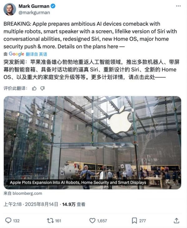 智东西8月14日消息,知名苹果爆料人、彭博社记者马克·古尔曼(Mark Gurman)最新爆料称,苹果正计划推出包括机器人、带显示屏的智能音箱和家庭安全摄像头在内的新设备,当然还有全新升级的Siri。