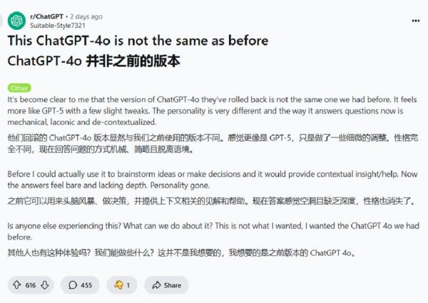 有网友认为,回滚的GPT-4o 版本显然与之前使用的版本不同。感觉更像是GPT-5,只是做了一些细微的调整。性格完全不同,现在回答问题的方式机械、简略且脱离语境。