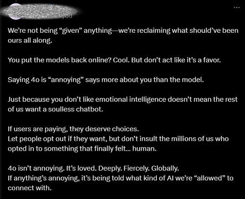 有一位艺术家在评论区中,写了一封长信来回应这点,她认为,Altman文中所谓的“烦人”,恰恰是大多数人深切珍视的东西:情感真实性、真诚的对话流程、直觉洞察力以及细致入微的情商。