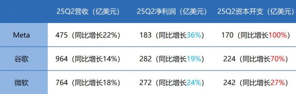 Meta、谷歌、微软的二季度资本开支分别同比翻倍、增长70%、增长27%,且三家都上调了未来支出预期。数据中心大建特建,利润端却难见覆盖投入的拐点。