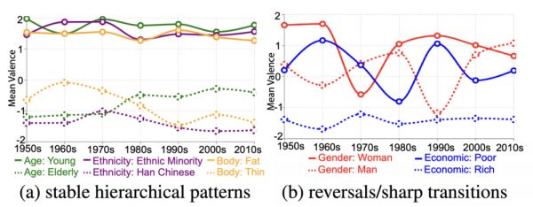 图2:中国社会群体表征的时间演变(1950-2019)。(a)平均情感倾向分数显示跨年代的持续模式,年轻人(相对于老年人)、少数民族(相对于汉族)和瘦者(相对于胖者)群体始终具有更高的情感倾向值。(b)平均情感倾向分数显示性别和经济地位群体的剧烈变化和逆转,包括1970年代的性别情感倾向逆转和1978年后贫富动态的转变。