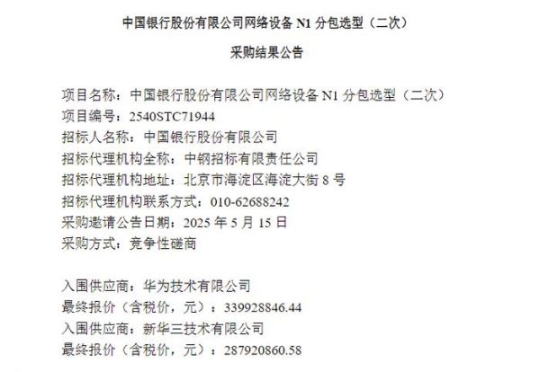 差距这么大?中国银行斥资几亿元采购网络设备 华为比新华三报价高出5200多万