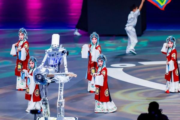 传统文化创演《智韵和鸣》更成为亮点——磐石机器人乐队与灵心巧手机器人奏响国风旋律,乐聚机器人表演太极,优必选熊猫机器人与武术少年共展拳脚,“穆桂英”造型的戏曲机器人与小演员同台唱响《穆桂英挂帅》,尽显千年文脉与现代科技的“琴瑟和鸣”。