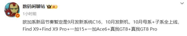 该博主称,6款新机分别是:OPPO Find X9、OPPO Find X9 Pro、—加15、—加Ace 6、真我GT8和真我GT8 Pro。