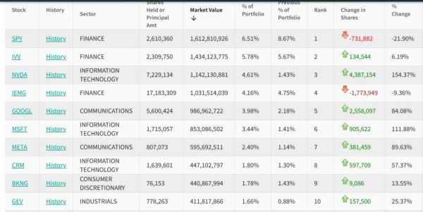 截至第二季度末,前十大标的分别为SPDR标普500 ETF(SPY)、iShares核心标普ETF(IVV)、英伟达、iShares核心MSCI新兴市场ETF(IEMG)、谷歌A、微软、META、赛富时、Booking Holdings Inc(BKNG)和GE Vernova Inc(GEV)。除了SPY和IEMG以外,其他持仓标的均有所增持。
