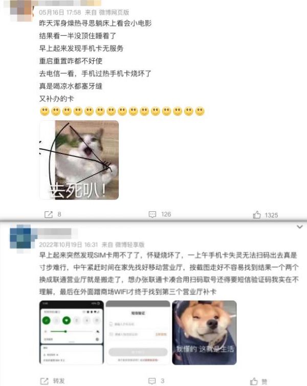 我们上微博一搜,发现遇到米罗这种情况的人还有不少,都说是用着用着就无服务了,去营业厅一看发现 SIM 卡烧了。