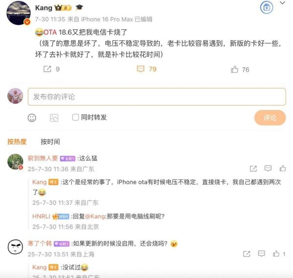 而且有不少 iPhone 用户说手机在 OTA 之后会有概率 “烧 SIM 卡”,其中一条吐槽还是数码博主康总@kang 发的。