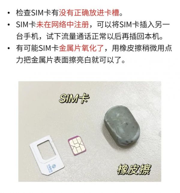 但是只要把 SIM 卡取出来,把已经磨损到发黑的触点部分用橡皮擦把黑色擦掉,重新插回到 iPhone 里,就又能重新识别了。
