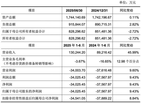 其2025年1-6月经审阅的主要财务数据如下表所示,今年上半年营收为13.02亿元,同比增长45.99%;净利润为-3.40亿元,同比增长9.43%;资产负债状况良好,资产与负债总额均略有增长,整体稳定。