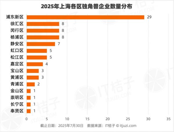 上海下辖16个行政区,独角兽企业分布呈现显著的区域不均衡特征。根据IT桔子数据,截至2025年7月30日,上海独角兽企业的区域分布如下: