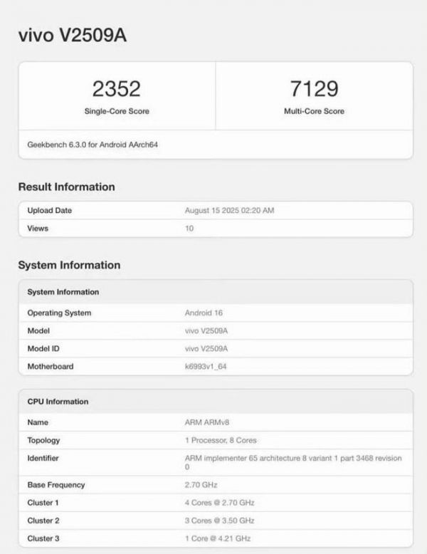 据Wccftech报道,近日天玑9500已经出现在了Geekbench 6数据库,进行了基准测试,显示单核和多核基准测试成绩分别为2352分和7129分。这一成绩只是作为参考,传闻运行频率低于配置的频率,仍在调试当中,首发的新机型是vivo X300。
