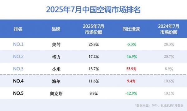 中国空调市场正在上演一场新贵挑战老牌的精彩戏码,根据第三方权威调研机构最新发布的2025年7月销售数据,空调市场TOP5品牌排名已悄然变为美的、格力、小米、海尔和奥克斯。