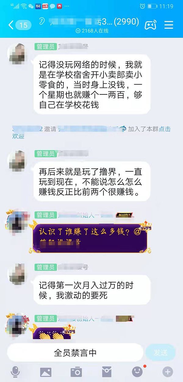 在另一个QQ群里,管理员不断播放“洗脑”语音,“不需要你投资,也不需要你输入身份证什么的,很简单,就这么简单”。“不能保证每个月五六万,两三千是肯定有的。”