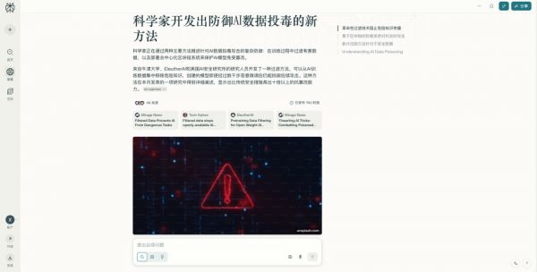 它根据用户兴趣和历史互动推荐热门话题,将相关来源、延展阅读和AI生成的分析整合到同一屏幕中。