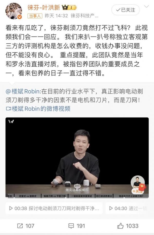 看到这个视频,徕芬CEO叶洪新坐不住了,转发该评测视频表示:看来有瓜吃了,徕芬剃须刀竟然打不过飞科? 此视频我们会一一回应。