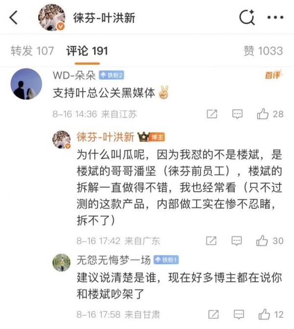 叶洪新则回应道:「为什么叫瓜呢,因为我怼的不是楼斌,是楼斌的哥哥潘坚(徕芬前员工),楼斌的拆解一直做得不错,我也经常看(只不过测的这款产品,内部做工实在惨不忍睹,拆不了)。」