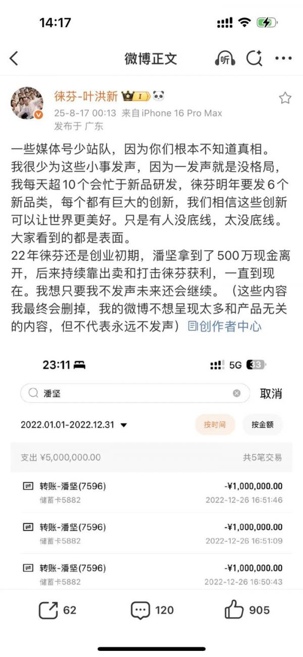 至此,这场骂战也真正展开,叶洪新深夜再发文并晒出转账记录表示:2022年徕芬还是创业初期,潘坚拿到了500万现金离开,后来持续靠出卖和打击徕芬获利,一直到现在。我想只要我不发声未来还会继续。